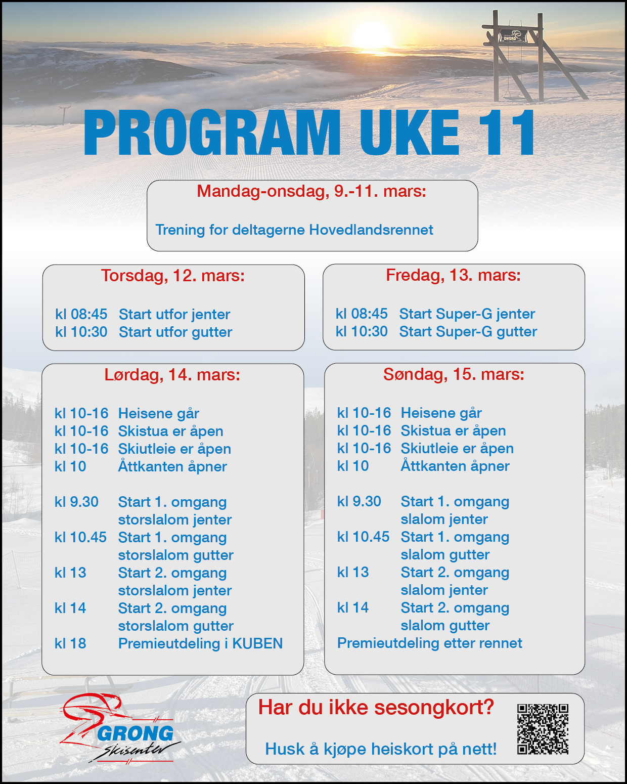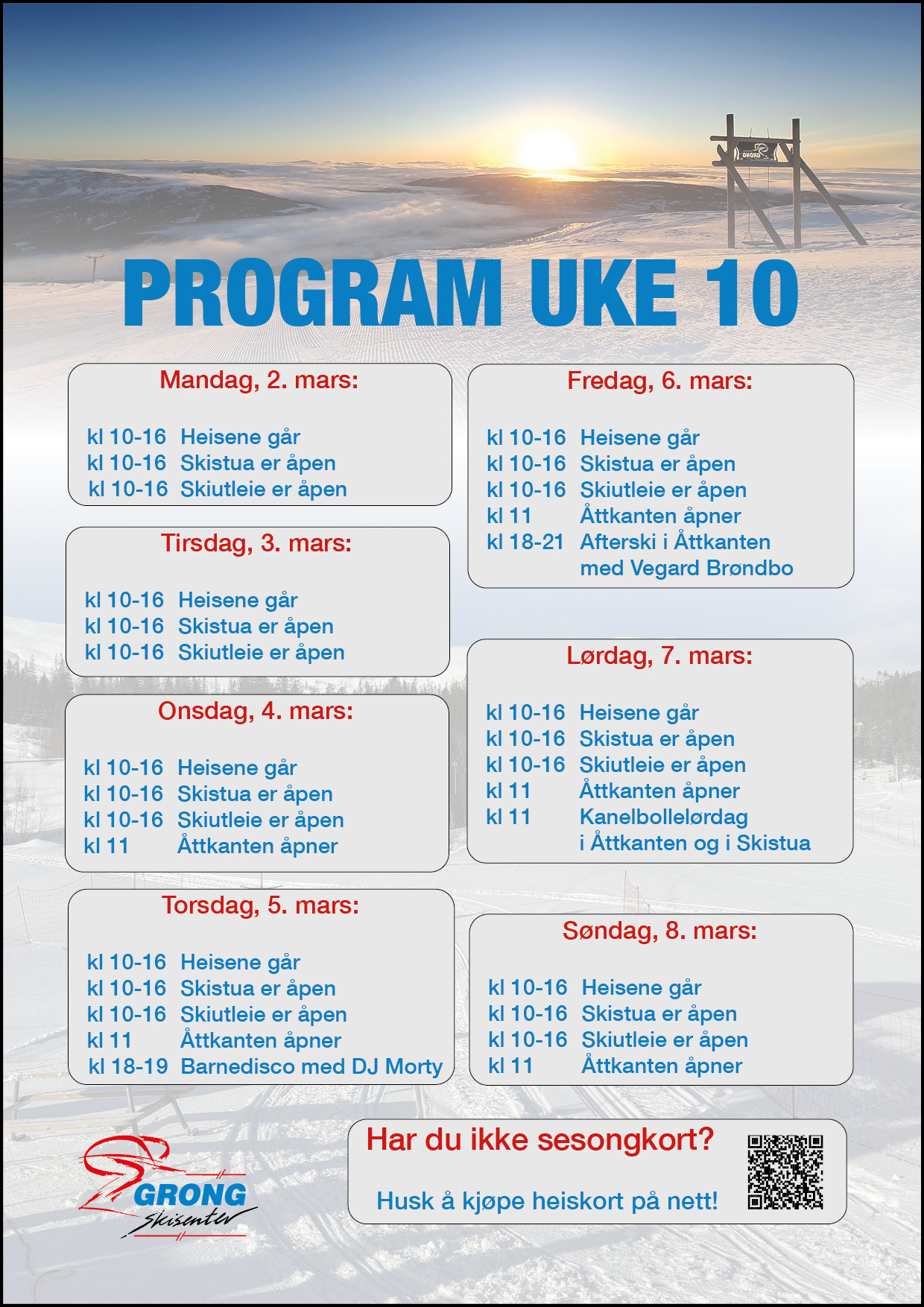 Klar for vinter? Velkommen til Bjørgan! Ski og vær glad 7 Se priser og kjøp heiskort her Åpningstider sesongen 25/26 Kjøp heiskort Overnatting Hva skjer? Kommende arrangementer 09 mars HOVEDLANDSRENNmar 9Les mer 21 mars Grongmesterskapetmar 21Les mer Se alle arrangementer Vær og føreforhold